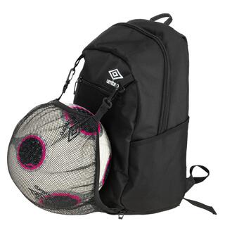 Ryggsekk med ballnett. Praktisk sekk med separete rom til treningstøy og utstyr. Vannavvisende ytterside. Ballnett på yttersiden som enkelt pakkes ned i egen lomme. Justerbare og polstrede skulderstropper.